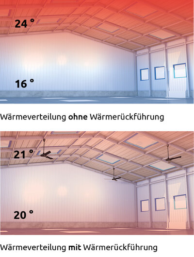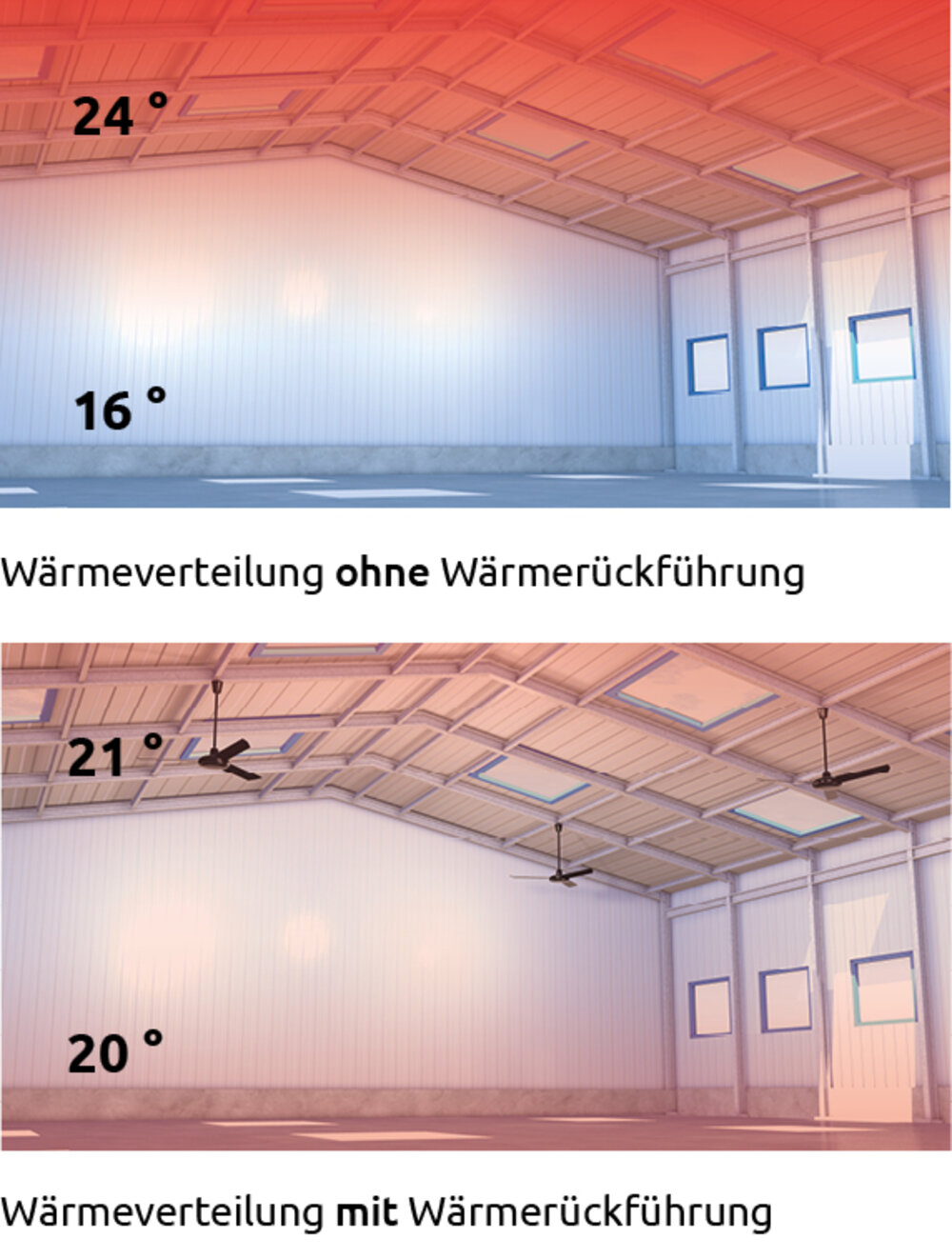 Unsere Wärmerückführungssysteme sorgen für einen effektiven Ausgleich zwischen Boden- und Deckentemperatur, der zu einer Heizkostenersparnis von bis zu 30 % führt.
