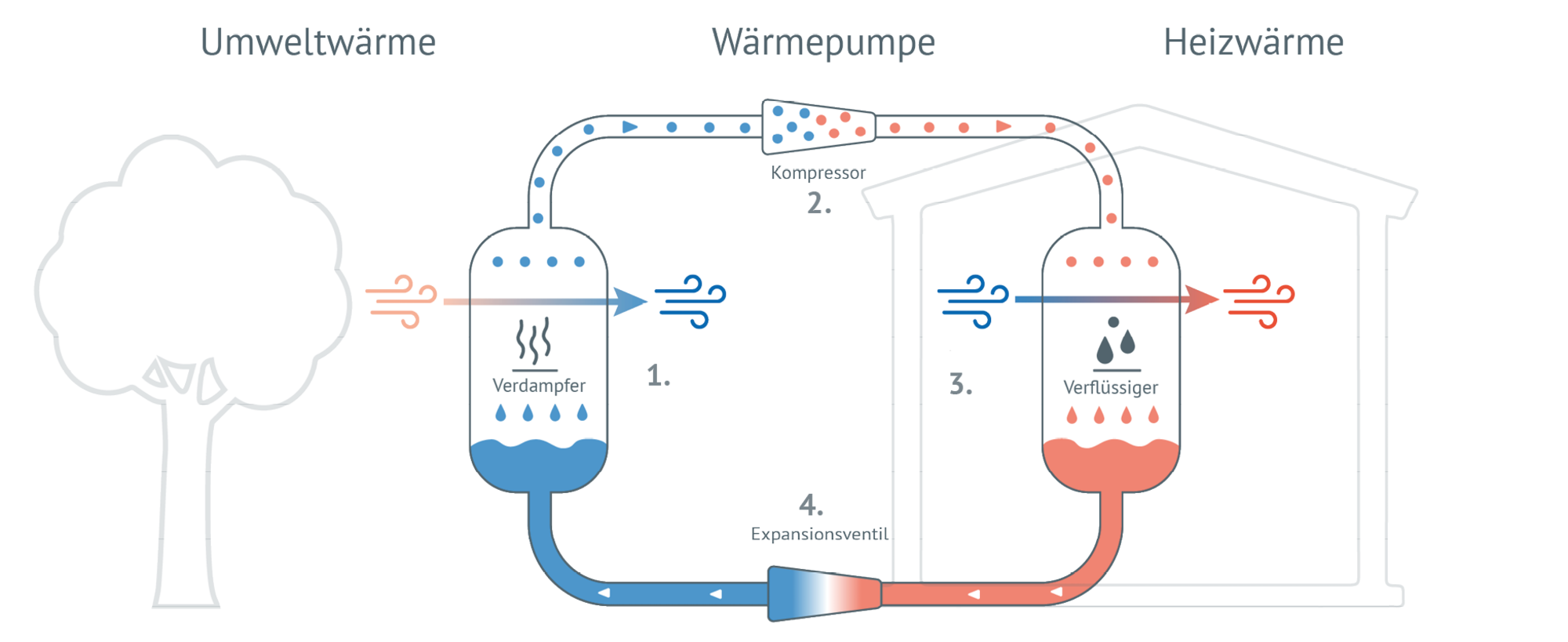 1. Das Kältemittel im WP-Verbundsystem nimmt beim Durchströmen des Wärmetauschers mit Luft eine bestimmte Wärmemenge aus der Umgebung auf (Verdampfereinheit, außerhalb des Gebäudes). Die Temperatur des Wärmeträgers steigt um ca. 5°C leicht an