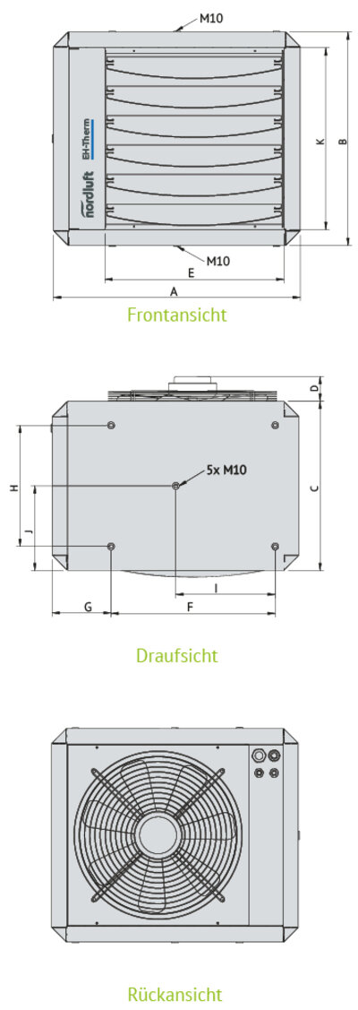 | Heizleistung | Elektrische Anschlussleistung | Maximaler elektrischer Strom | Absicherung | Maximale Warmluftleistung | Wurfweite | Spannungsversorgung | Gewicht | Schalldruckpegel (5m) | Minimale Montagehöne | Art.-Nr. |