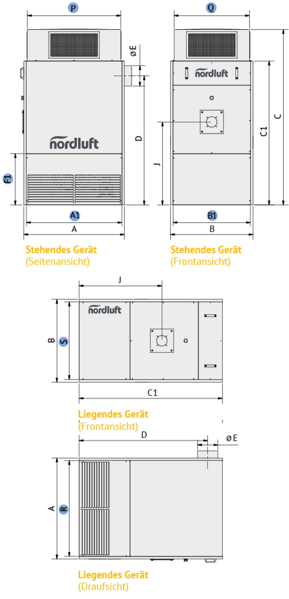 | Typ | A | B | C | C1 | D* | E Ø* | J* | kg | A1 | B1 | F1 | P | Q | R | S |