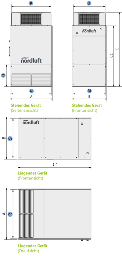 | Alle Maße in mm P + Q - Kanalanschlussmaße Ausblas R + S - Ausschnittsmaße Kanalanschluß Bodenplatte | ||||||||||||