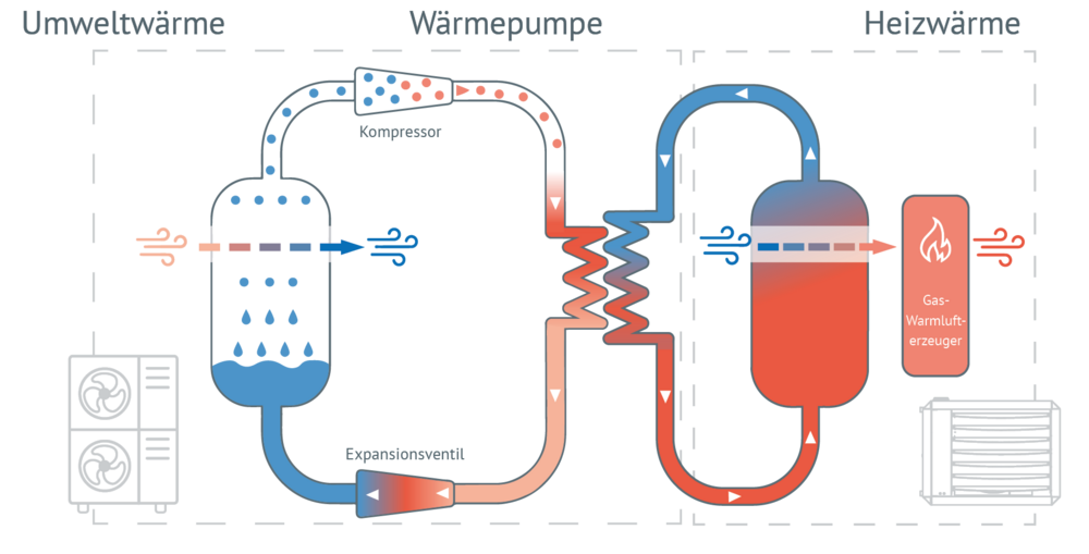 Der Energielieferant Luft ist umweltfreundlich und nahezu unerschöpflich. Die Luft-Wasser-Wärmepumpe entzieht der Umgebungsluft Wärme, gibt diese über den Kältekreislauf (Kältemittel R32) und einen Plattenwärmetauscher an den Wärmeträger Wasser ab. Das erwärmte Wasser wird anschließend durch das Heizregister im Innengerät geführt und erwärmt dadurch die Hallenluft. Dadurch kühlt sich das Wasser ab und der Kreislauf beginnt von vorne. Die Grundlast des Gebäudes wird vorrangig über die Heizleistung der Wärmepumpe gedeckt. Erst sobald die maximale Heizleistung der Luft-Wasser Wärmepumpe erreicht ist (Bivalenzpunkt), wird der Gasbrennwert-Warmlufterzeuger als Spitzenlasterzeuger zugeschaltet.