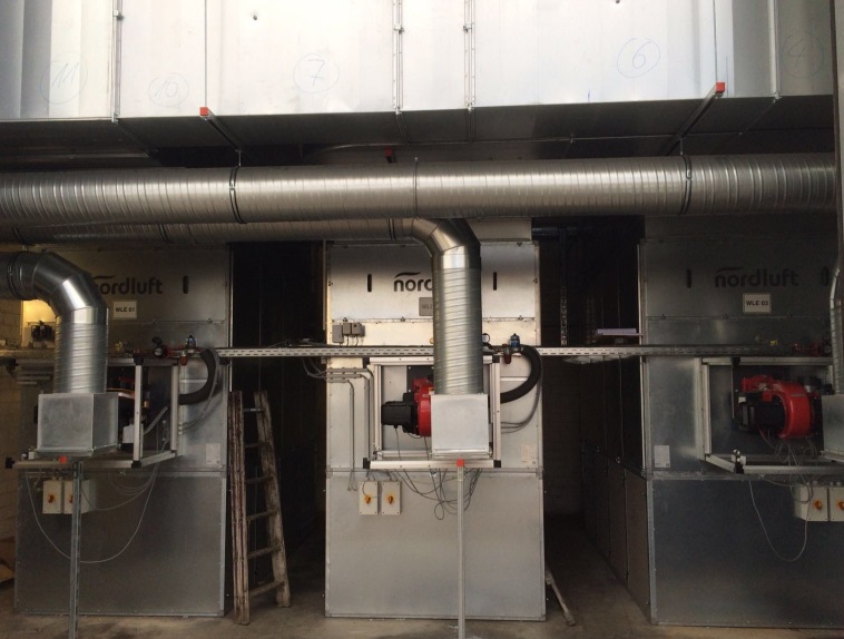 Einsatz von drei nordluft Warmlufterzeugern mit einer Heizleistung von jeweils 860 kW. Die Brennkammer besteht aus chromlegiertem, hochhitzebeständigem Edelstahl. Der Rohrbündel-Wärmetauscher, ebenfalls aus legiertem Edelstahl, ist mit Rauchgaswirbulatoren und Kondensatablaufstutzen ausgestattet.