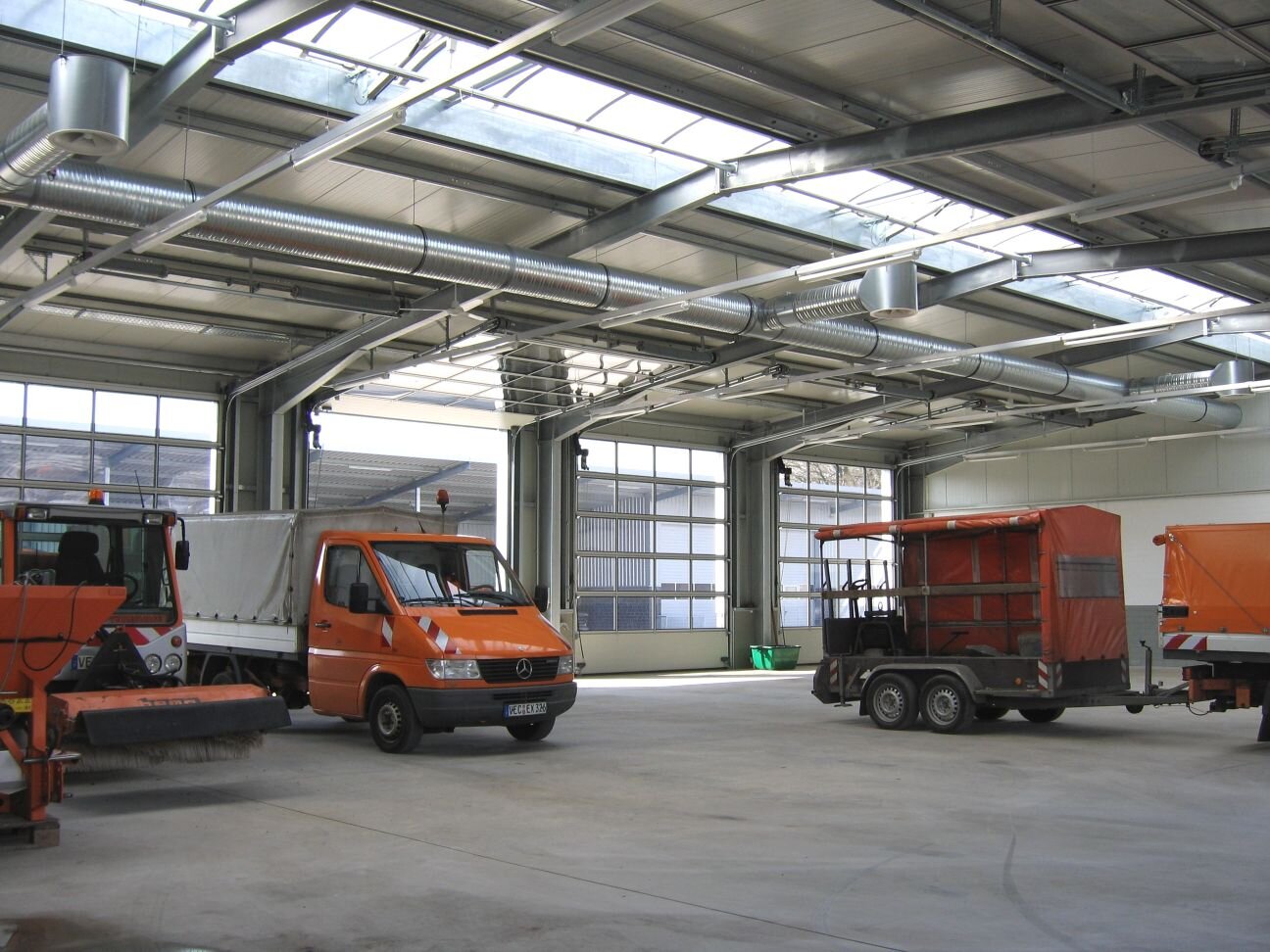 Beheizung des Neubaus des städtischen Bauhofs mit einer Biomasse-Warmlufterzeugeranlage inkl. Brennstoff-Vorratsbunker und zusätzlicher Warmwassererzeugung.