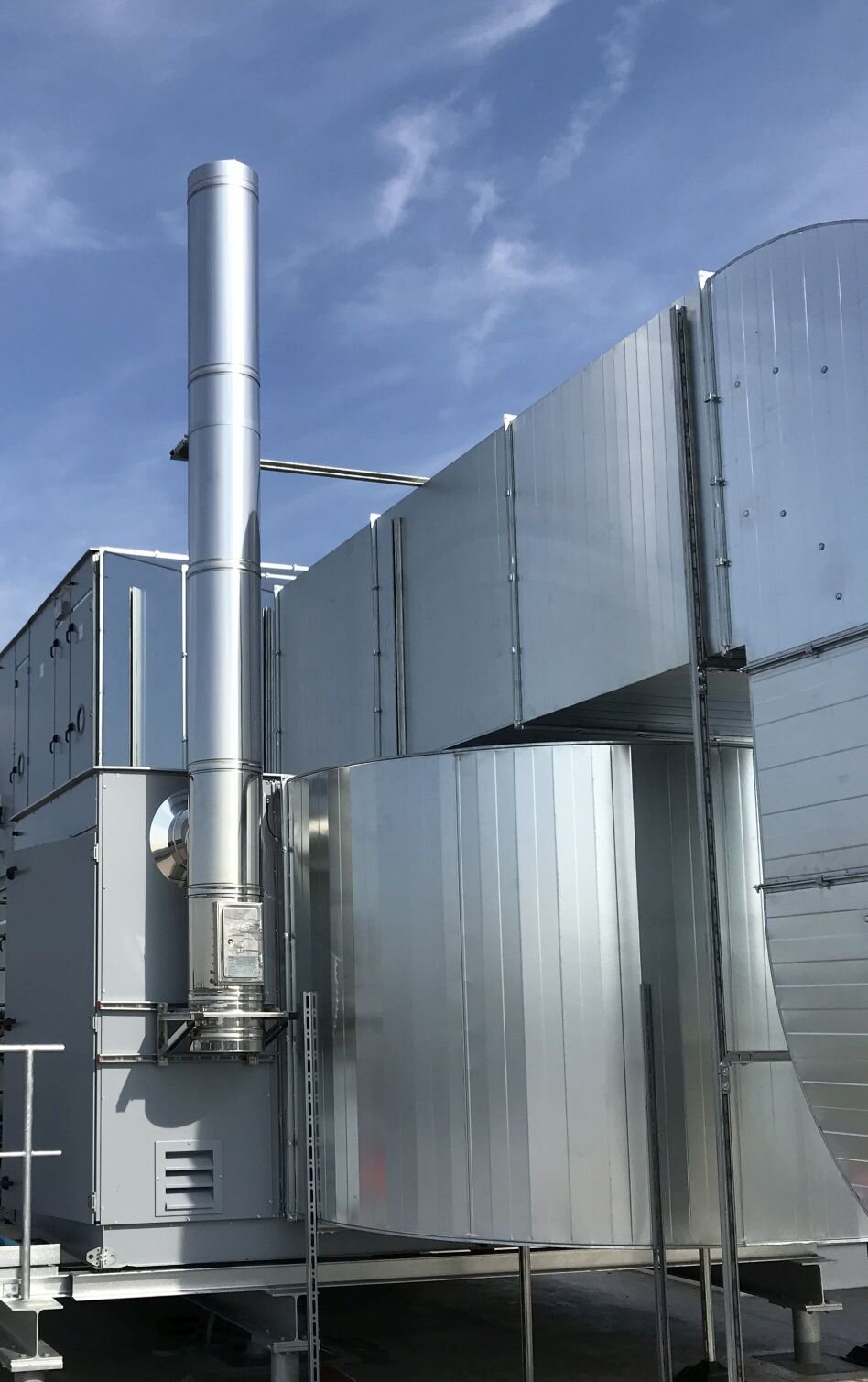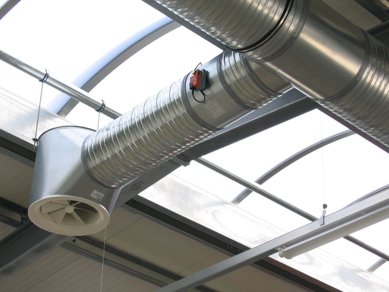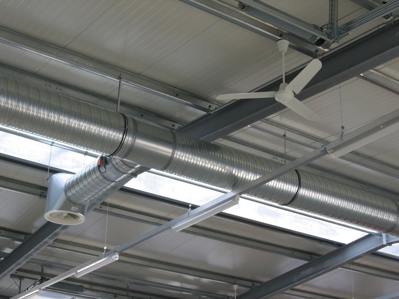 Aufstellung des Biomasse-Warmlufterzeugers im Heizraum sowie Zu- und Abluftkanal- und –rohrsystem in die verschiedenen Räumlichkeiten wie z.B. Fahrzeughalle und Werkstatt. Luftverteilung über Drallauslässe. Zonenschaltung zur Versorgung der verschiedenen Räumlichkeiten mit Luft je nach Temperaturanforderung.
