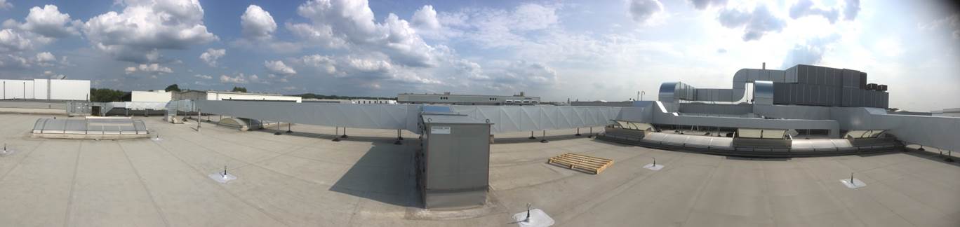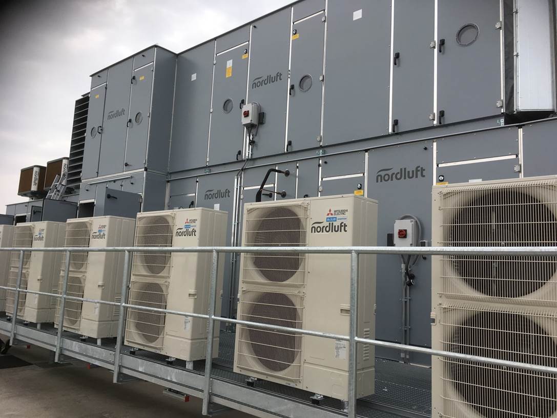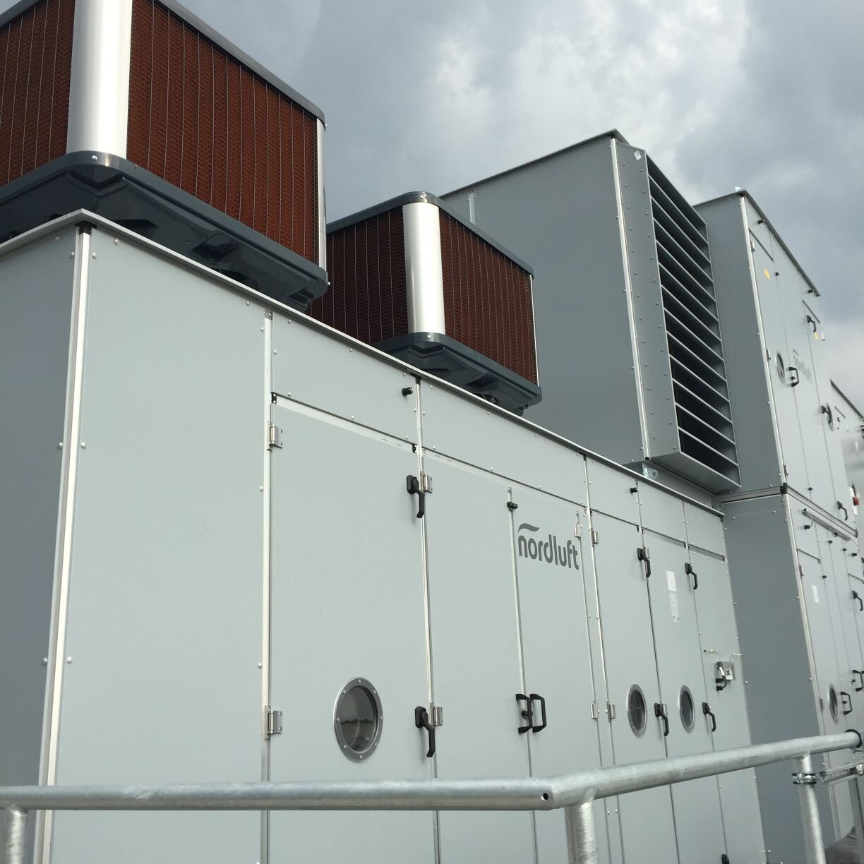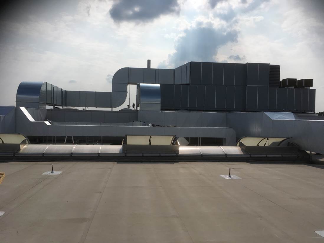 Aufstellung des Biomasse-Warmlufterzeugers im Heizraum sowie Zu- und Abluftkanal- und –rohrsystem in die verschiedenen Räumlichkeiten wie z.B. Fahrzeughalle und Werkstatt. Luftverteilung über Drallauslässe. Zonenschaltung zur Versorgung der verschiedenen Räumlichkeiten mit Luft je nach Temperaturanforderung.