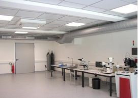 Es wurde ein Zu-/Abluftgerät vom Typ NL-1 mit Wärmerückgewinnung (WRG) geeignet für eine Innenaufstellung installiert. Dieses hat eine Luftleistung von 2.800 bzw. 1.400 m³/h. Das eingesetzte Nachheizregister verfügt über eine Heizleistung von 34 kW. Die Heizleistung, die durch die Wärmerückgewinnung erzielt wird beläuft sich auf 16,8 kW. Die Wärmerückgewinnung wird über einen Kreuzstromwärmetauscher mit Bypass realisiert. Die Ablufttemperatur-Regelung der Reinraumlüftung erfolgt über eine Minimalbegrenzung der Zuluft.